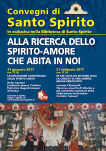 Tornano i Convegni di Santo Spirito ed avranno per il 2017 il tema “Alla ricerca dlelo spirito-amore che abita in noi”. Gli appuntamenti si svolgeranno in esclusiva nella Biblioteca del Convento.