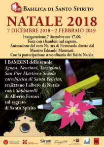 il 7 dicembre alle 17 sul Sagrato di Santo Spirito accenderemo assieme l’albero con i sabbiarelli di Alberto Ferrari e realizato dai bambini delle scuole Agnesi, Nencioni, Torrigiani, San Pier Martire e Scuola catechistica di Santa Felicita. Ad allietare la Festa l’animazione del coro Na’ara di Firenzuola diretto dal Mastro Edoardo Materassi ed i canti natalizi della Compagnia di Babbo Natale!