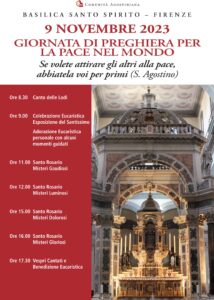 vi invitiamo a vivere una giornata di preghiera, di silenzio davanti all’Eucarestia per continuare a chiedere al Signore, Dio della Vita, il dono della Pace. Incessante deve essere la nostra preghiera perché il Signore tocchi il cuore di coloro che sono più responsabili di tutte le guerre nel mondo. Ma chiediamo anche che il dono della pace regni nel cuore di ogni uomo e di ogni donna.