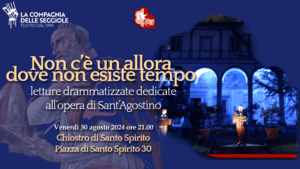 La Compagnia delle Seggiole è lieta di presentare per il settimo anno “Non c’è un allora dove non esiste tempo“, letture drammatizzate dedicate all’opera di Sant’Agostino, scritto da Riccardo Ventrella. Lo spettacolo è promosso assieme alla Comunità Agostiniana di Santo Spirito e si svolgerà venerdì 30 agosto 2024 alle ore 21.