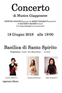 Il 18 giugno alle ore 19.00 la nostra Basilica ospiterà il concerto di Musica Giapponese del trio Satsuki Adachi (Soprano), Akiko Tanaka (Pianoforte) e Sachiko Okabe (Violino), accompagnate dal Coro femminile Aurora. L’ingresso è libero. Condividi:Tweet Fai clic per condividere su WhatsApp (Si apre in una nuova finestra) WhatsApp Fai clic qui per stampare (Si apre in una nuova finestra) Stampa Pubblicato il 5 Giugno 2018Pubblicato in: ConcertiPost precedente:I Depositi, mostra fotografica nel Chiostro di Santo Spirito Post successivo:Video del Convegno di Antonio Paolucci