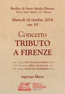 Martedì 16 ottobre alle ore 19 la nostra Basilica ospiterà il concerto “Tributo a Firenze” promosso da Banca Generali Private. Tenore Matteo Macchioni, Pianoforte Mirca Rosciani, Violino Gennaro Desiderio. L’ingresso è libero. Condividi:Tweet Fai clic per condividere su WhatsApp (Si apre in una nuova finestra) WhatsApp Fai clic qui per stampare (Si apre in una nuova finestra) Stampa Pubblicato il 13 Ottobre 2018Pubblicato in: ConcertiPost precedente:Floralia per Santo Spirito – 6 e 7 ottobre Post successivo:Albino Todeschini – Il verbo si è fatto marmo