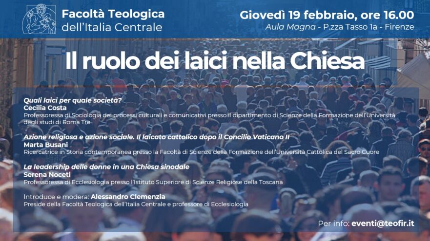 Giovedì 19 febbraio la Facoltà Teologica dell’Italia Centrale organizza, presso la propria Aula Magna in Piazza Tasso 1 a Firenze, il convegno dal titolo “Il ruolo dei laici nella Chiesa”, un momento di studio e approfondimento dedicato alla presenza e alla responsabilità del laicato nella vita ecclesiale e nella società contemporanea.