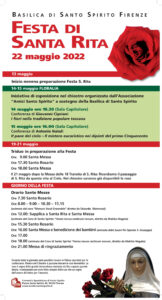 Il 22 maggio, Giorno della Festa di Santa Rita, alle 7.30 il Santo Rosario, alle ore 8, 9, 10.30 e 11.15 le Sante Messe animate dal Coro Menura Vocal Ensemble diretto dal Maestro Materassi, alle ore 12 la Supplica a Santa Rita e la Santa Messa, alle ore 15.30 il Santo Rosario, alle 16.00 la Santa Messa con benedizione dei bambini (animata dalle Suore Pie Operaie di San Giuseppe), alle ore 17.00 Santa Messa, alle 18.00 Santa Messa (animata dal Coro di Santo Spirito), alle ore 21.00 Messa di Ringraziamento.