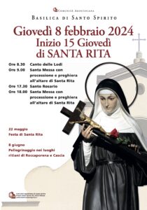 La Comunità Agostiniana di Santo Spirito è lieta di annunciare l’inizio, il giorno 8 febbraio 2024, dei 15 Giovedì di Santa Rita 2024 che accompagneranno alla Festa della Santa Agostiniana del 22 maggio.