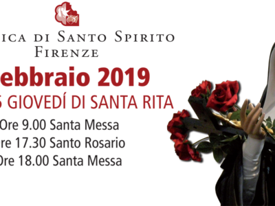 Il 7 febbraio in Santo Spirito inizeranno i 15 giovedì di Santa Rita, istituiti dalla Chiesa allo scopo di commemorare i 15 anni che Santa Rita portò sulla fronte la dolorosa ferita arrecatala dalla spina. I giovedì precedono la festa della Santa Agostiniana, che ricorre il 22 maggio. Ogni giovedì saranno celebrate due SS. Messe ed il Rosario in Basilica.