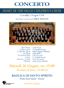 Martedì 26 giugno alle ore 19, con ingresso libero, il concerto del coro “Heart of the Vallery Children’s Choir” Condividi:Tweet Fai clic per condividere su WhatsApp (Si apre in una nuova finestra) WhatsApp Fai clic qui per stampare (Si apre in una nuova finestra) Stampa Pubblicato il 23 Giugno 2018Pubblicato in: ConcertiPost precedente:La Brighton Orchestra in concerto a Santo Spirito Post successivo:L’orchestra giovanile di Irvine in concerto a Santo Spirito