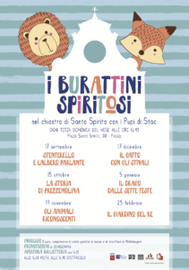 A partire dal 17 settembre, ogni terza domenica del mese alle ore 16.45, nel Chiostro di Santo Spirito appuntamento con i Pupi di Stac, Compagnia teatrale fiorentina che dal 1946 incanta grandi e piccini con i propri pupi, ovvero burattini in legno intagliato dell’altezza di circa 60 centimetri. La Compagnia vide tra i primi collaboratori Paolo Poli, seguito poi dalla sorella Laura che, coaudivata dal figlio Enrico, porta avanti oggi questo progetto.