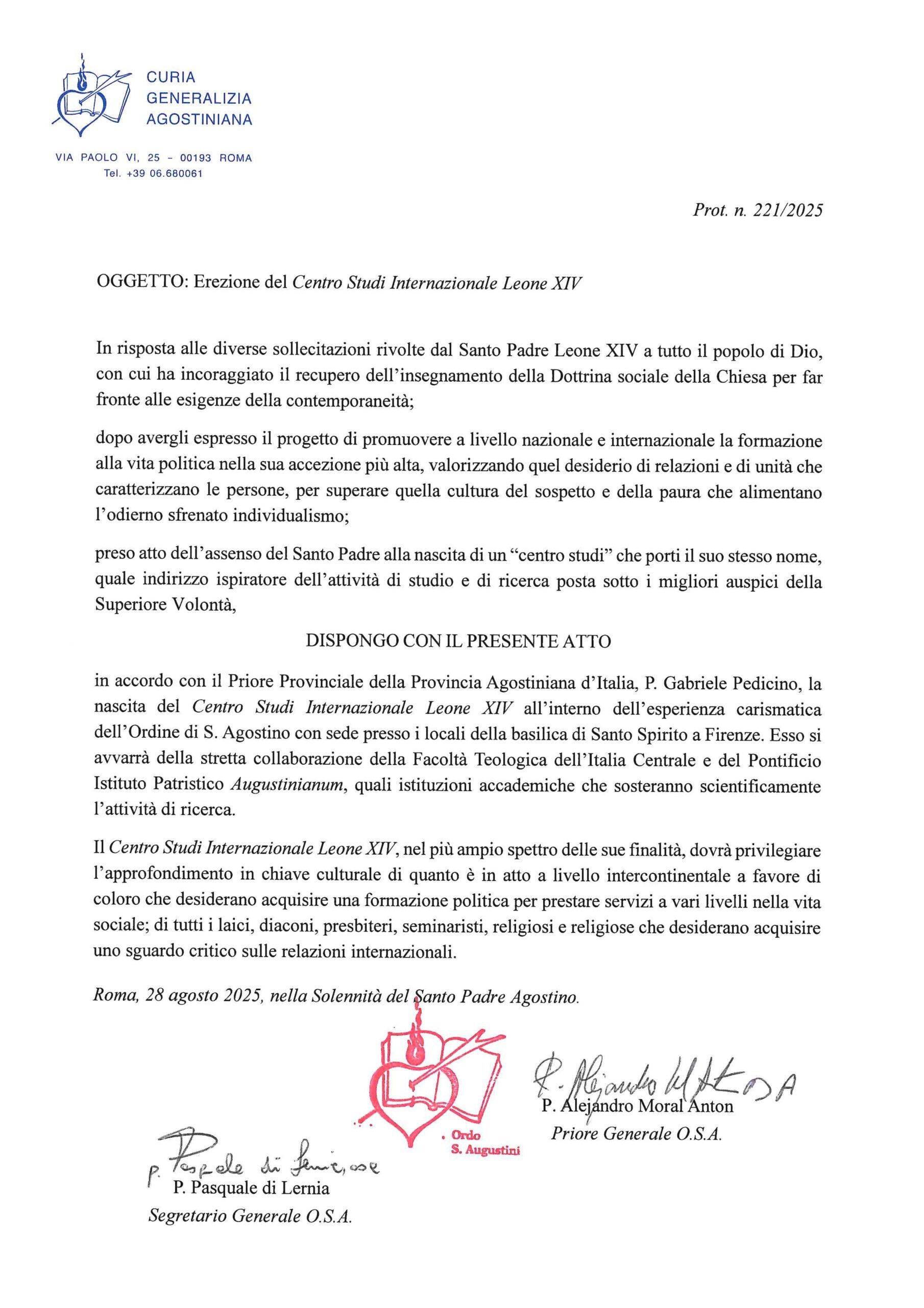 Il Centro è stato eretto nell’agosto 2025 nell’ambito dell’Ordine di Sant’Agostino, con l’assenso del Santo Padre, mediante Decreto del Priore Generale dell’Ordine, Padre Alejandro Moral Antón, in accordo con il Priore Provinciale della Provincia Agostiniana d’Italia, Padre Gabriele Pedicino.