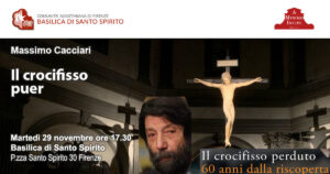 Appuntamento il 29 novembre 2022 alle ore 17.30 nella Sacrestia della Basilica di Santo Spirito per la conferenza di Massimo Cacciari su Il crocifisso puer. Ingresso libero fino ad esaurimento posti, prevista la diretta su Facebook.