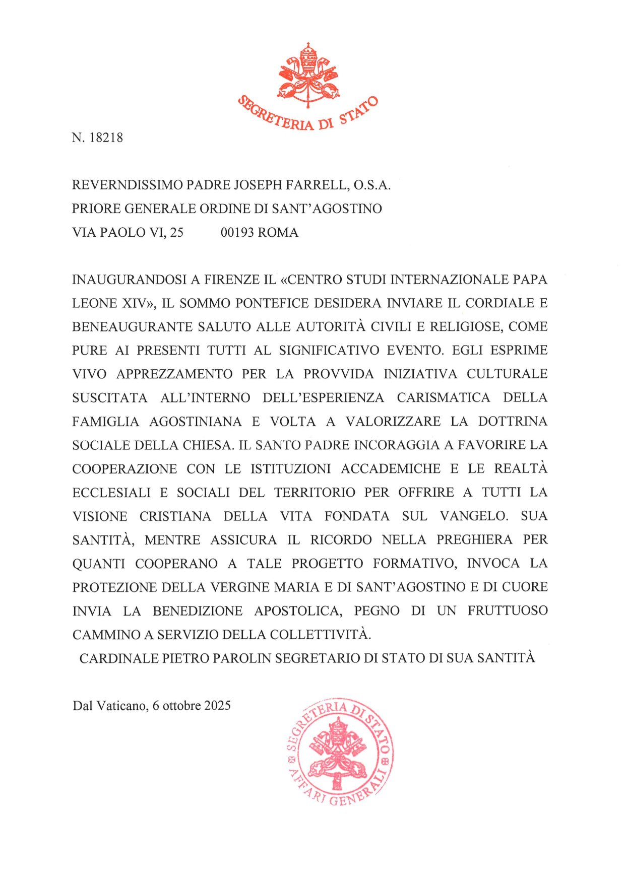 In occasione dell’inaugurazione a Firenze del Centro Studi Internazionale Papa Leone XIV, la Segreteria di Stato Vaticana ha trasmesso una lettera indirizzata al Reverendissimo Padre Joseph Farrell, O.S.A., Priore Generale dell’Ordine di Sant’Agostino.