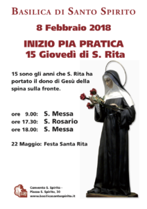 Giovedì 8 febbraio avrà inizio la Pia Pratica dei 15 giovedì di Santa Rita che condurranno alla Festa del 22 maggio. Inizio Condividi:Tweet Fai clic per condividere su WhatsApp (Si apre in una nuova finestra) WhatsApp Fai clic qui per stampare (Si apre in una nuova finestra) Stampa Pubblicato il 3 Febbraio 2018Pubblicato in: NotiziePost precedente:Santo Spirito saluta il presepe della Basilicata Post successivo:Inizio del tempo di Quaresima con la celebrazione delle Ceneri