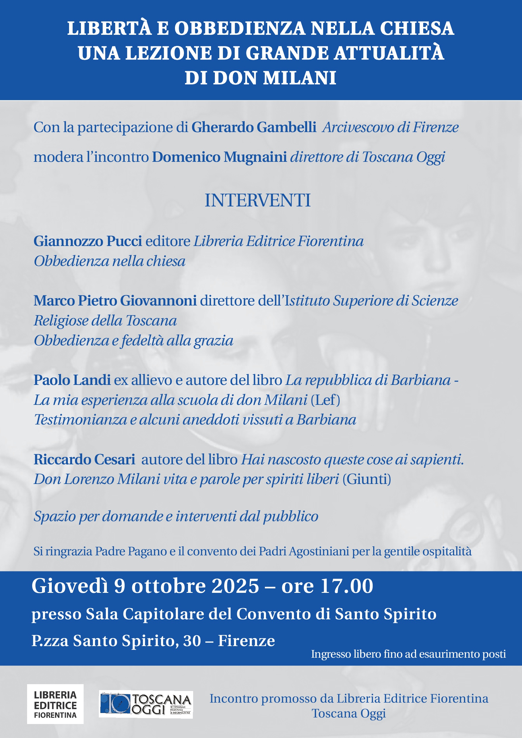 La Basilica di Santo Spirito è lieta di accogliere, giovedì 9 ottobre 2025 alle ore 17.00 presso la Sala Capitolare del Convento, l’incontro dal titolo “Libertà e obbedienza nella Chiesa. Una lezione di grande attualità di Don Milani”, promosso da Libreria Editrice Fiorentina e Toscana Oggi.