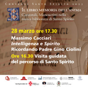 Con questo appuntamento, si aprono ufficialmente i Convegni di Santo Spirito – sessione primaverile 2025, che avranno come filo conduttore il tema “Il Libro – Memoria dell’Anima” e accompagneranno un evento di grande rilievo per la nostra comunità: l’inaugurazione della nuova Biblioteca di Santo Spirito (6 maggio 2025), custode del fondo antico del convento, che sarà dedicata a Padre Stanislao Bellandi.