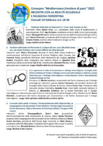 Nell’ambito del Convegno “Mediterraneo frontiera di pace 2022” la nostra Basilica ospiterà uno degli incontri con la realtà ecclesiale e religiosa fiorentina. Giovedì 24 febbraio alle ore 18.30 in Sala Capitolare si terrà Le esperienze in atto di Ecumenismo e dialogo interreligioso: Consiglio delle Chiese Cristiane di Firenze; il dialogo con le comunità ebraica e islamica; Scuola fiorentina per il Dialogo interreligioso e interculturale; Centro Internazionale Studenti Giorgio La Pira. Nella locandina allegata il dettaglio degli interventi e dei relatori, nonché degli altri Incontri che si terranno in San Marco, Santissima Annunziata e San Lorenzo.