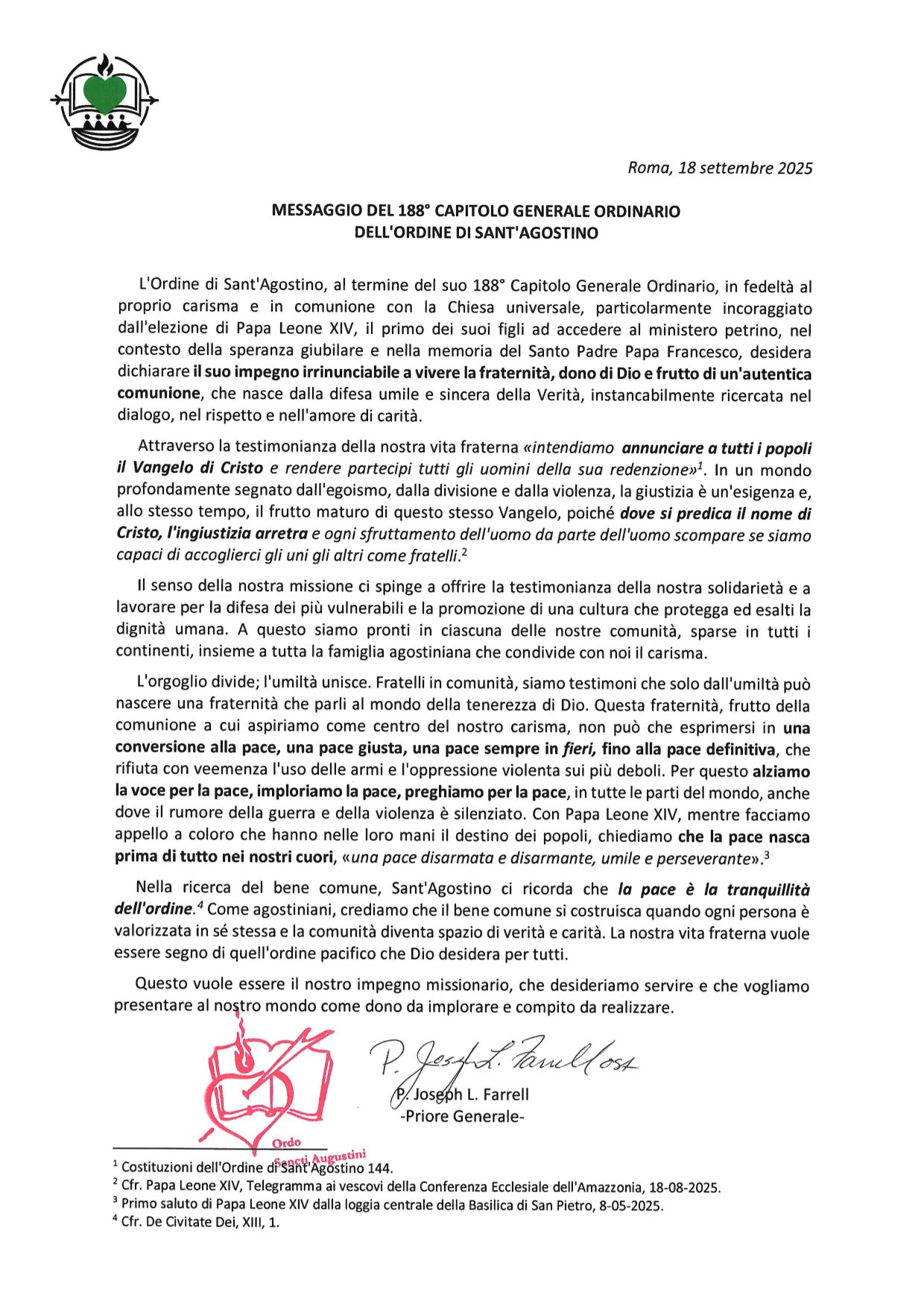 abbiamo il piacere di condividere con voi il Messaggio conclusivo del 188º Capitolo Generale dell’Ordine di Sant’Agostino, celebrato a Roma.