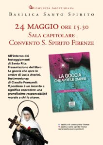 La Comunità Agostiniana di Santo Spirito di Firenze è lieta di invitare la cittadinanza sabato 24 maggio alle ore 15.30, presso la Sala Capitolare del Convento di Santo Spirito, alla presentazione del libro “La goccia che apre le ombre – Storie di cammini” di Lucia Aterini, edito da Libreria Editrice Fiorentina.