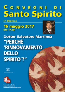 Il 16 maggio alle ore 17.30 nuovo appuntamento con i Convegni di Santo Spirito, ciclo di incontri promossi dalla Comunità Agostiniana di Firenze sotto il coordinamento di Mons. Giovanni Scanavino OSA. “Perché rinnovamento dello Spirito Santo?” è il tema che sarà affrontato da Salvatore Martinez, presidente del Rinnovamento dello Spirito Santo. Sulla pagina di wikipedia sono disponibili approfondite note biografiche sul relatore.