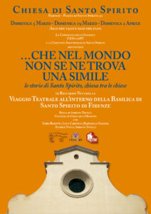 La Comunità Agostiniana di Santo Spirito è lieta di annunciare uno straordinario evento in prima assoluta, promosso con La Compagnia delle Seggiole ed il CRALgiàBT: … CHE NEL MONDO NON SE NE TROVA UNA SIMILE. Le storie di Santo Spirito, chiesa tra le chiese. Un viaggio teatrale alla scoperta della nostra Basilica, scritto da Riccardo Ventrella e diretto da Sabrina Tinalli. Protagonisti Fabio Baronti, Luca Cartocci, Raffaello Gaggio, Andrea Nucci e Sabrina Tinalli. Costumi di Giancarlo Mancini.
