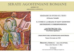 Venerdì 18 novembre alle ore 19.30 presso la Biblioteca Angelica in Piazza di Sant’Agostino a Roma un seminario di studio sul testo di Giacomo Tantardini “Il Cuore e la Grazia in sant’Agostino Distinzione e corrispondenza” a cura di Padre Virgilio Pacioni – OSA, Professore emerito di Patrologia e Filosifa presso l’Istituto Patristico Augustinianum.