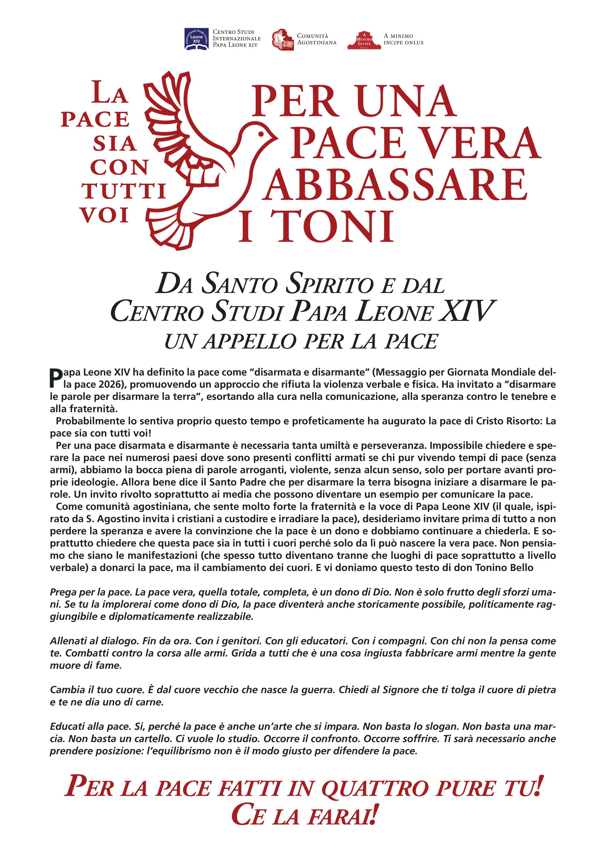 In un tempo segnato da tensioni, conflitti e parole sempre più aggressive, la ComunitàAgostiniana di Santo Spirito, insieme al Centro Studi Internazionale Papa Leone XIV, desidera condividere un semplice ma profondo appello alla pace.