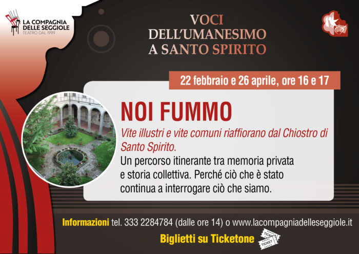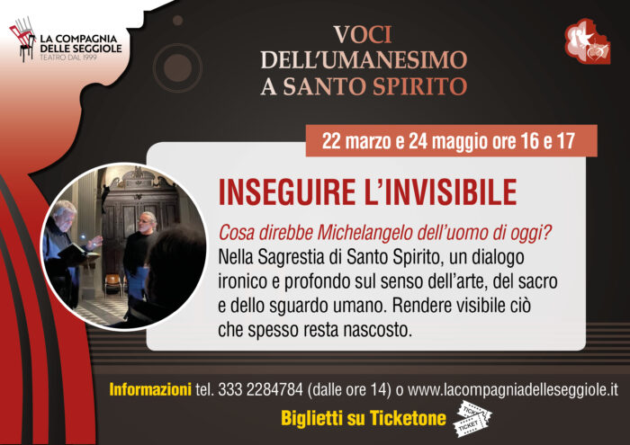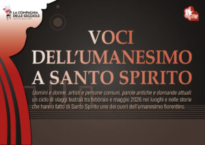 Da febbraio a maggio 2026, nell’ambito dei Convegni di Santo Spirito – di cui a breve sarà data notizia – la Compagnia delle Seggiole torna con la rassegna “Voci dell’Umanesimo a Santo Spirito”, un percorso teatrale in tre appuntamenti, ospitati in luoghi significativi del complesso monumentale e pensati per intrecciare parola, storia e spiritualità.